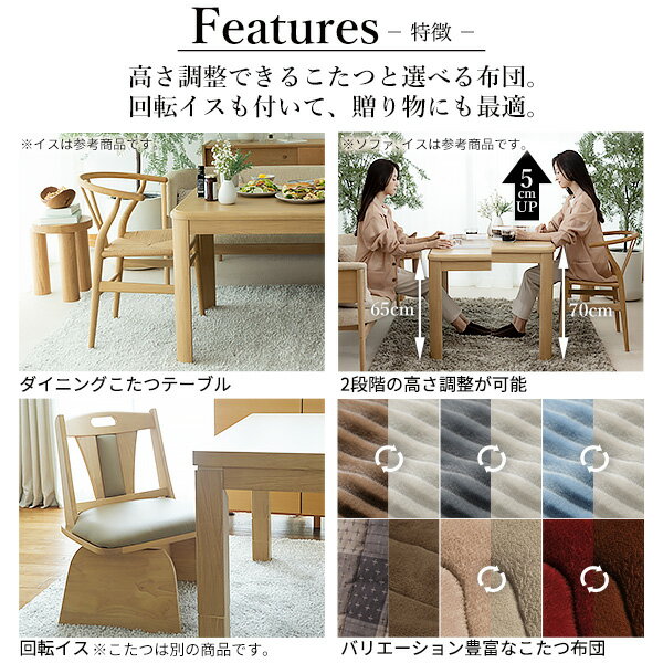 【セット構成】こたつx1台 布団x1枚 回転椅子x4脚 【仕様】 ■こたつ 天板:繊維板(転写プリント) 脚部:天然木(ラバーウッド) 薄型石英管ヒーター(500W・中間スイッチ式) ◎一部組立品(脚部取付) ■こたつ布団 [しじら]表地:綿100% 裏地:アクリル100% 中綿:ポリエステル100% [レンガ・ベージュ]表地・裏地:ポリエステル100%(はっ水フランネル) 中綿:ポリエステル100% ■回転椅子 フレーム:天然木 (アカシア) 座面:合成皮革 ◎一部組立品(脚部取付) 【サイズ】 ■こたつ 幅150x奥行90x高さ70/65cm・約23kg 天板:厚み30mm ■布団 [しじら織り]310x250cm・中綿約1.55kg [レンガ・ベージュ]312x252cm・中綿約780g ■回転椅子 幅46.5x奥行49x高さ75(70)cm・約9kg 株式会社ナカムラ(I-2700132)