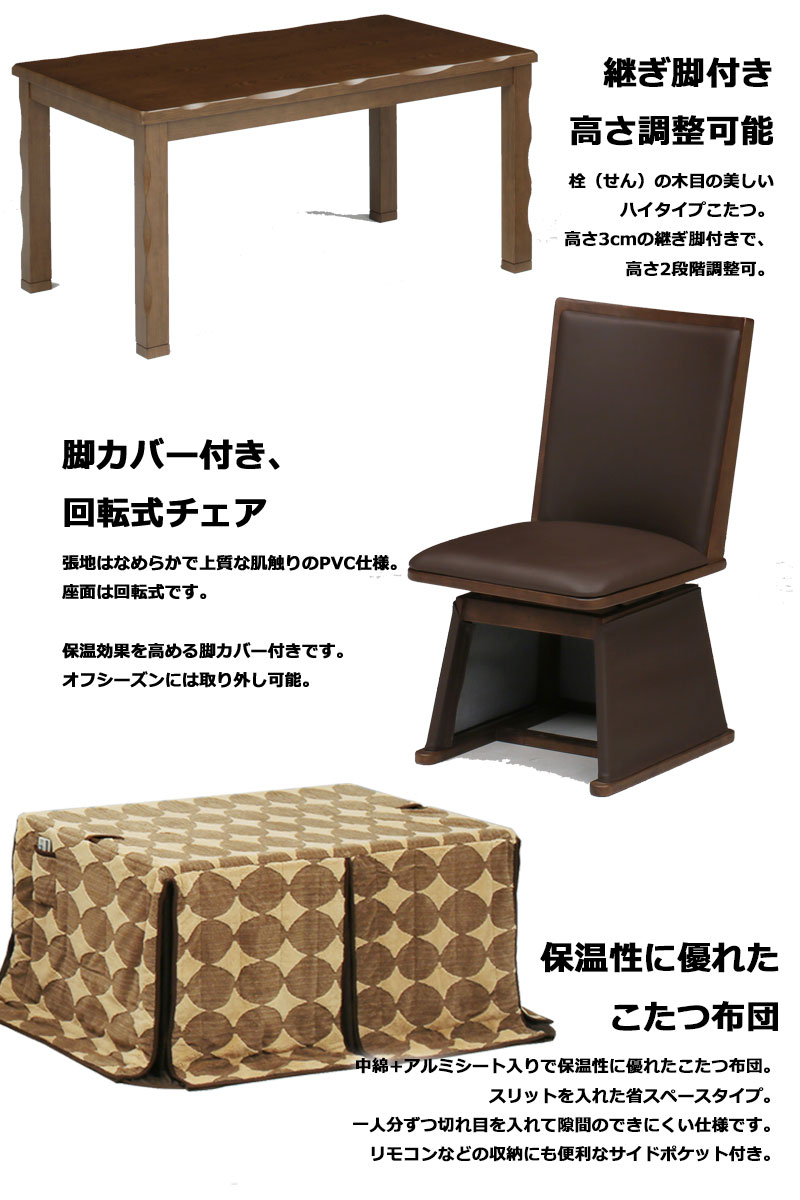 ■商品の特徴 一年中使えるダイニングこたつテーブル+掛け布団+回転チェアのこたつ6点セット。