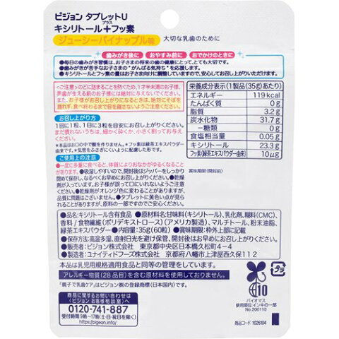 【品名・名称】キシリトール含有食品【ピジョン 親子で乳歯ケア タブレットU キシリトールプラスフッ素 パイナップル味の原材料】甘味料(キシリトール)、乳化剤、糊料(CMC)、香料/食物繊維(ポリデキストロース)(アメリカ製造)、マルチトール、粉末油脂、緑茶エキスパウダー【栄養成分】1製品(35g)あたりエネルギー:119kcal、たんぱく質:0g、脂質:3.2g、炭水化物:31.7g、-糖類:0g、食塩相当量:0.05g、キシリトール:23.3g、フッ素(緑茶エキスパウダー由来):10μg【アレルギー物質】アレルギー物質(28 品目)を含む原材料を使用しておりません。