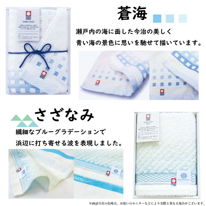 ●タオルサイズ(ウォッシュタオル) 【蒼海:340mm×360mm】 【華織ブルー、華織ピンク、海と空、さくら:340mm×350mm】 【さざなみ:330mm×330mm】 【共通】 ●化粧箱サイズ:20×15×4cm ●材質:綿100% ●日本製(今治産) ●◆◆◆● おすすめのギフトシーン ●◆◆◆● 出産内祝い 結婚内祝い 快気内祝い 快気祝い 引出物 引き出物 結婚式 新築内祝い お返し 入園内祝い 入学内祝い 就職内祝い 成人内祝い 退職内祝い 満中陰志 香典返し 志 法要 年忌 仏事 法事 法事引き出物 仏事法要 お祝い 御祝い ギフト 一周忌 三回忌 七回忌 出産祝い 結婚祝い 新築祝い 入園祝い 入学祝い 就職祝い 成人祝い 退職祝い 退職記念 お中元 お歳暮 お年賀 粗品 プレゼント お見舞い 記念品 賞品 景品 二次会 ゴルフコンペ ノベルティ 母の日 父の日 敬老の日 敬老祝い お誕生日お祝い バースデイ クリスマスプレゼント バレンタインデー ホワイトデー 結婚記念日 贈り物 ハンドタオル ゲストタオル おしぼりタオル 開店祝い 旧宅 旧居 新居 地鎮祭 近隣挨拶 タオル タオルセット セット 今治 引越し 挨拶 ギフト 誕生日 プレゼント 贈り物 お祝い お返し 内祝い 新築祝い 出産祝い 引っ越し プチギフト 粗品 退職お礼 あいさつギフト 引っ越し 挨拶ギフト プチギフト 挨拶回り 御挨拶 お返し お礼 白タオル マンション 近隣挨拶 手土産 工事 リフォーム 【楽ギフ_のし】 【楽ギフ_のし宛書】 【楽ギフ_包装】 【楽ギフ_包装選択】【熨斗 ラッピング無料】日本製で今治タオル工業組合の独自の品質基準を合格した商品(認証タグ付き) ※種類によりメーカーが異なり、肌触りも異なります。