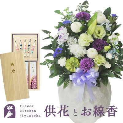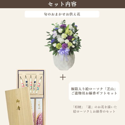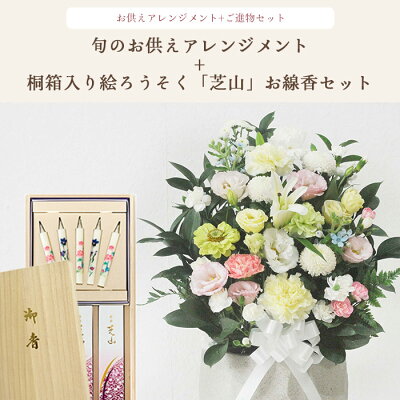 【お供えセット】供花アレンジ11000円&芝山 お線香 絵ろうそくセット桐箱入り日本香堂新盆 初盆 お盆 お彼岸 法事 命日 即日 ペット 枕花 お供え 仏事 弔事 喪中 年賀欠礼 仏花 喪中見舞い 新盆見舞 FKAA