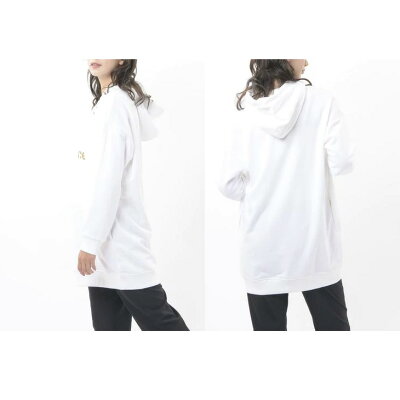 オーバーサイズシルエットのドレス丈フーディに、 大胆なゴールドのロゴを配した1枚。